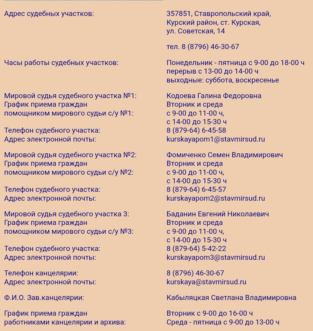 Электронная почта Курского районного суда Ставропольского края используется исключительно для рассылки корреспонденции и не предназначена для направления жалоб, исковых заявлений, заявлений о выдаче копий процессуальных актов и других обращений, связанных с реализацией процессуальных прав участников судопроизводства, поскольку подача таких обращений регламентируется нормами ГПК РФ, УПК РФ, КАС РФ, Порядком подачи в федеральные суды общей юрисдикции документов в электронном виде, утвержденным Приказом Судебного департамента при Верховном Суде РФ от 27.12.2016 N 251.